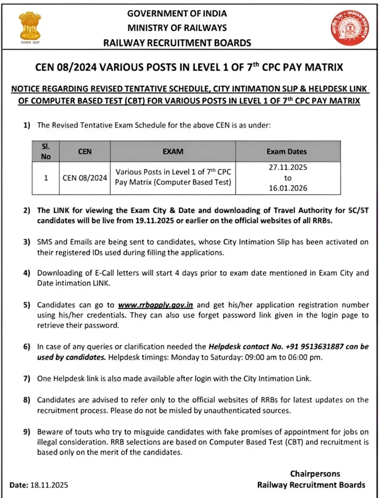 RRB Group D Exam Date 2025 घोषित कर दी गई है। यह परीक्षा 17 नवम्बर 2025 से शुरू होकर दिसम्बर 2025 के अंत तक चलेगी।